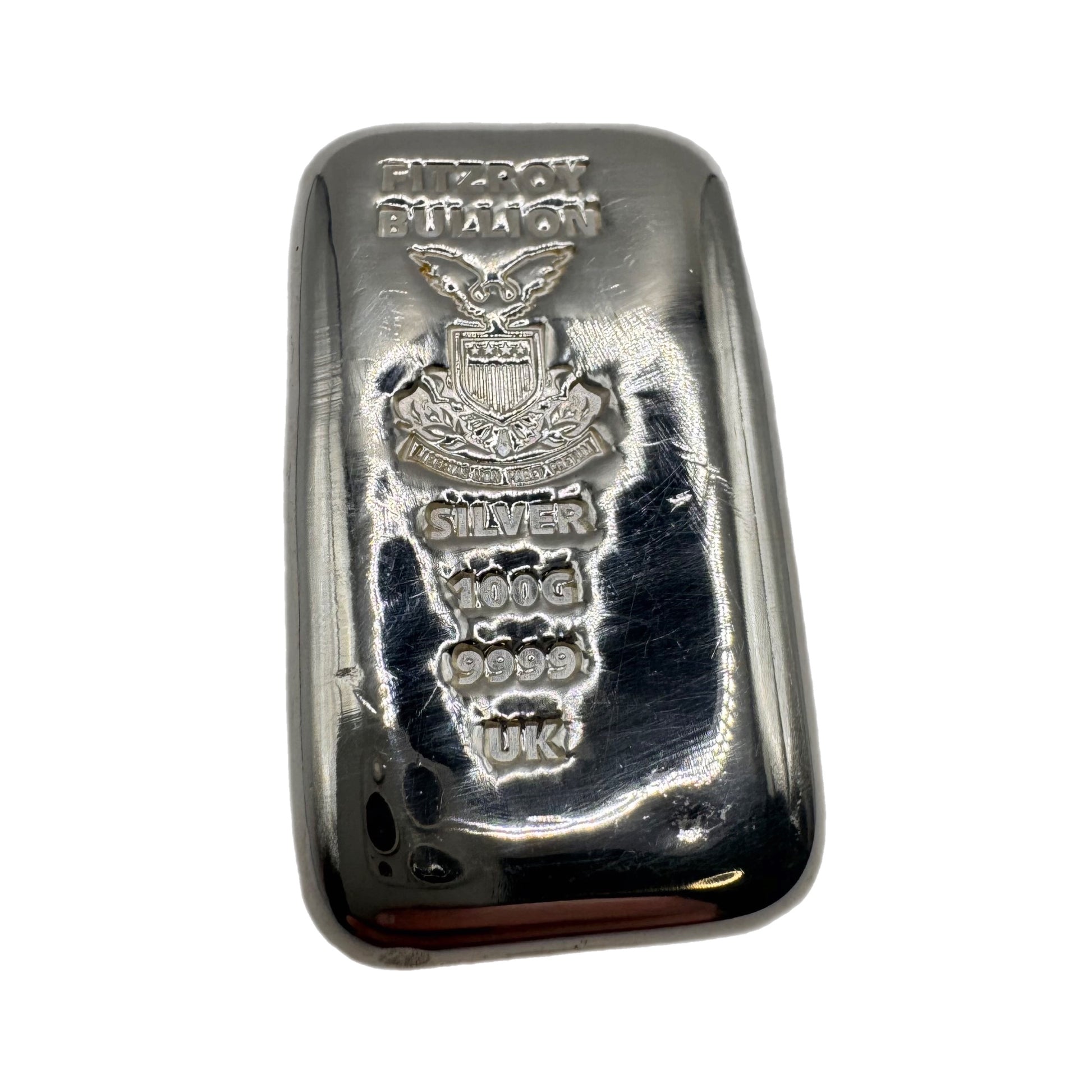 100g Silver Fitzroy Bullion 999 Fine Cast Bar, Produced by SMP Birmingham
