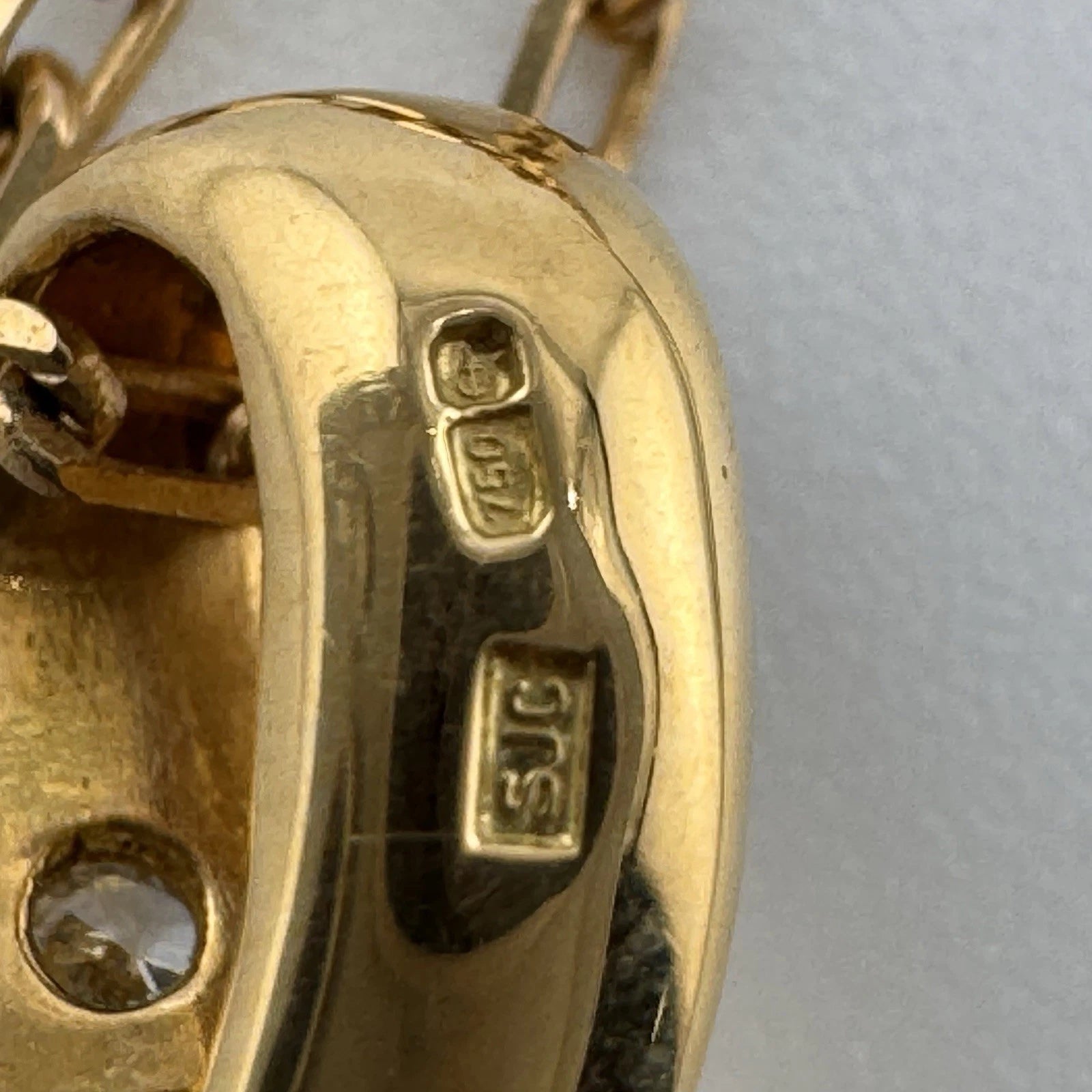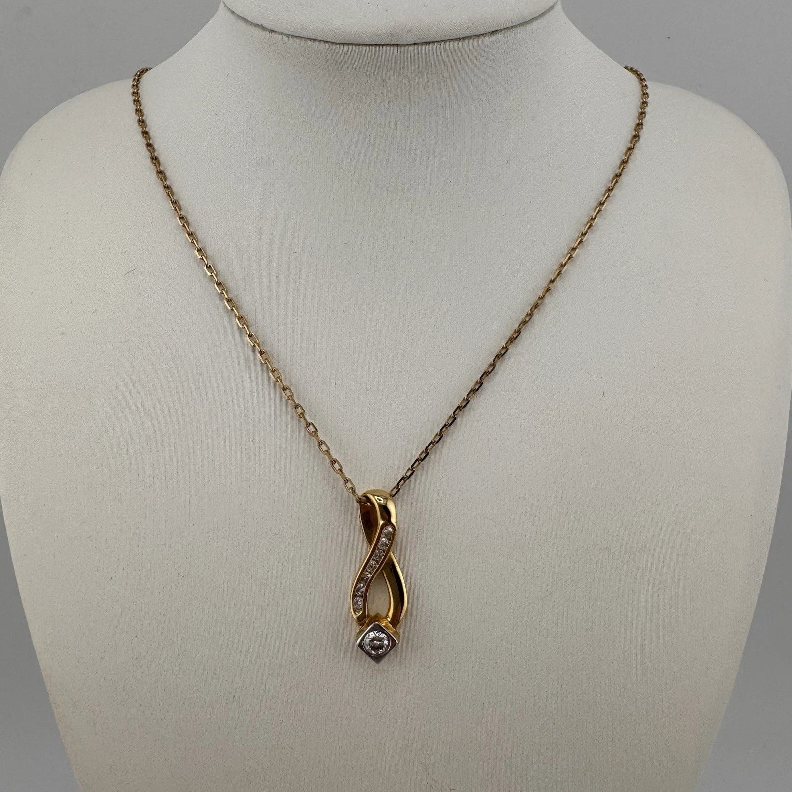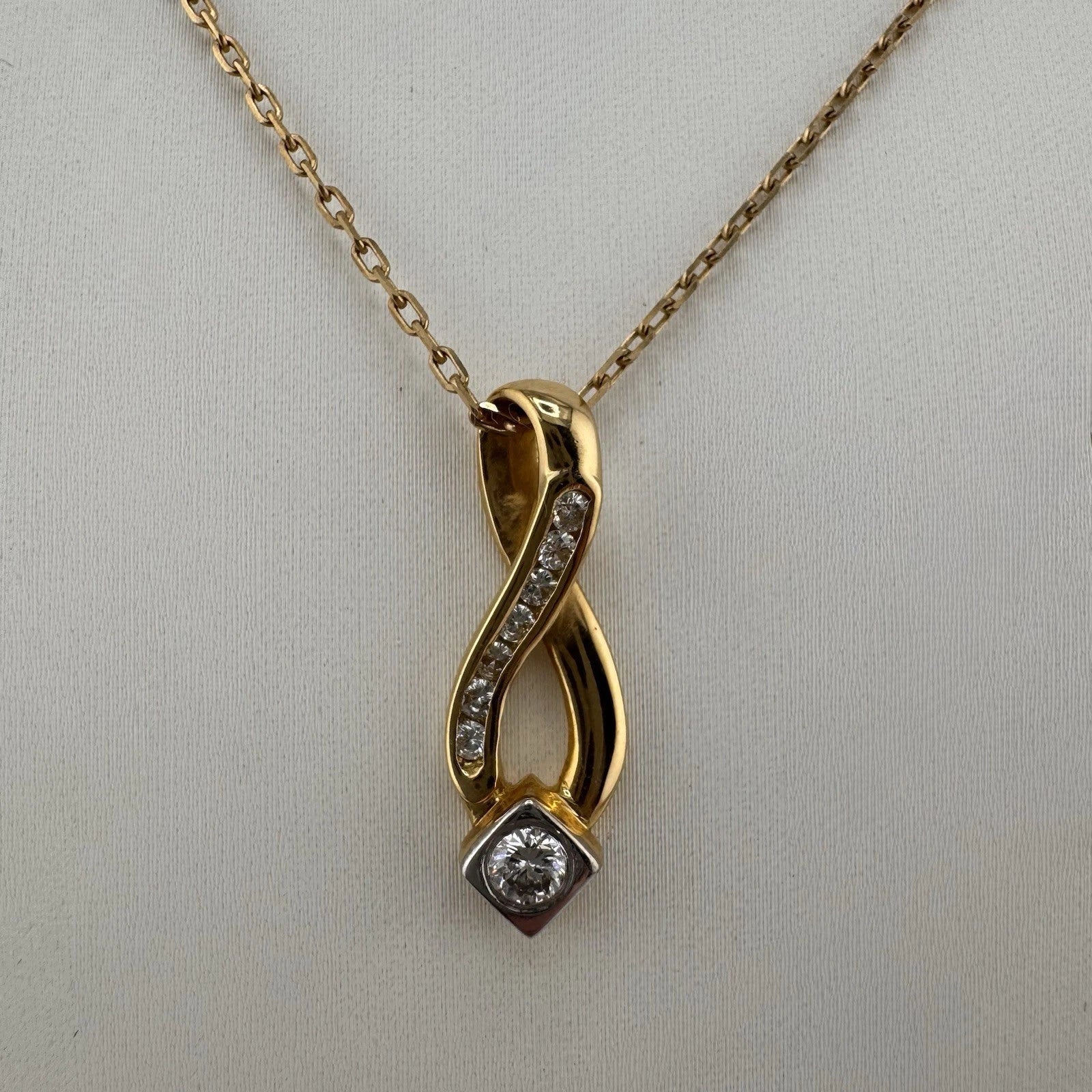 An 18ct gold pendant set with 0.4ct of natural diamonds with 0.25ct central round cut stone. Full UK hallmarks, 2.56g in excellent used condition. On a 9ct 18in box chain with full U.K. hallmarks 2.42g. 4.98g total weight.