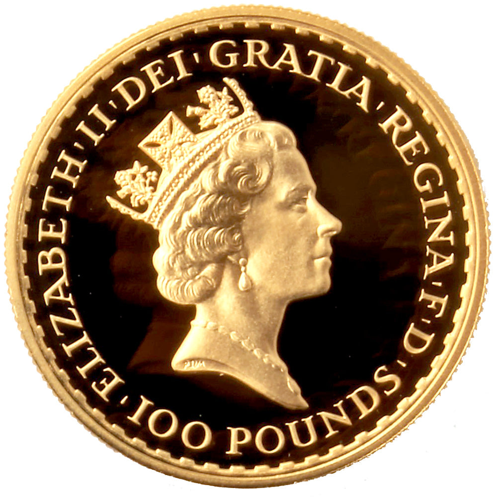 1987 (first year of issue) 1ozt Britannia coin with original Royal Mint display box and COA. Sold graded by NGC to PF67. Struck in 22ct weighing 34.05g with total fine gold content of 31.11g (1ozt).