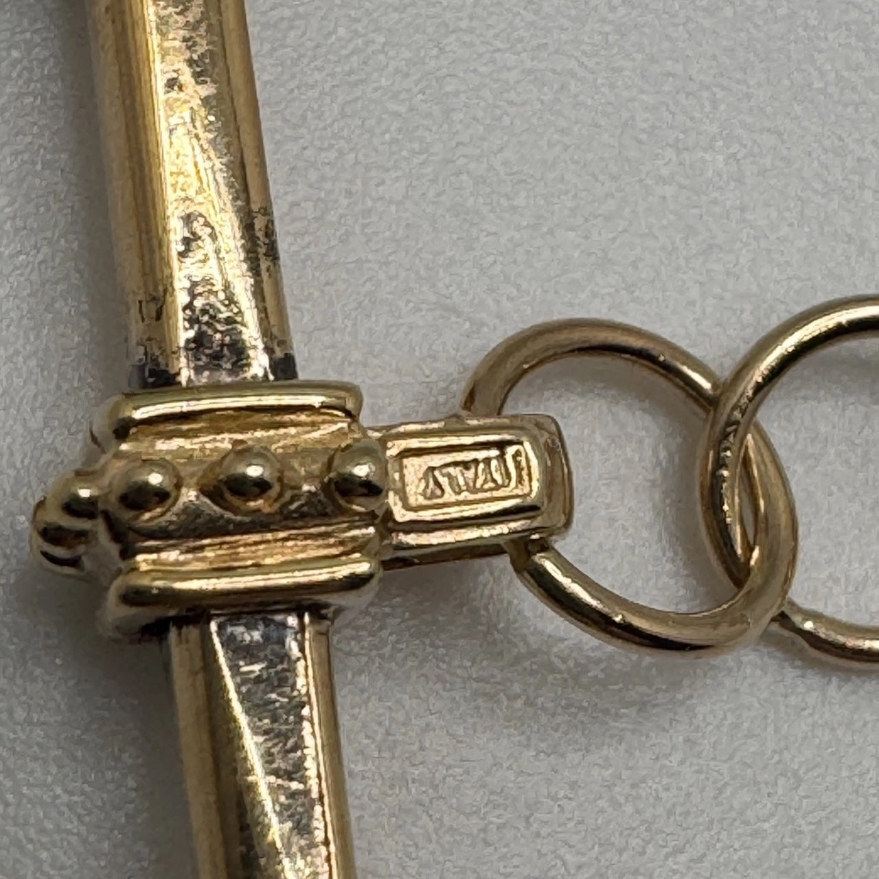 A unisex 9ct gold chain and T bar pendant, stamped 9ct and XRF tested. In excellent used condition, cleaned.