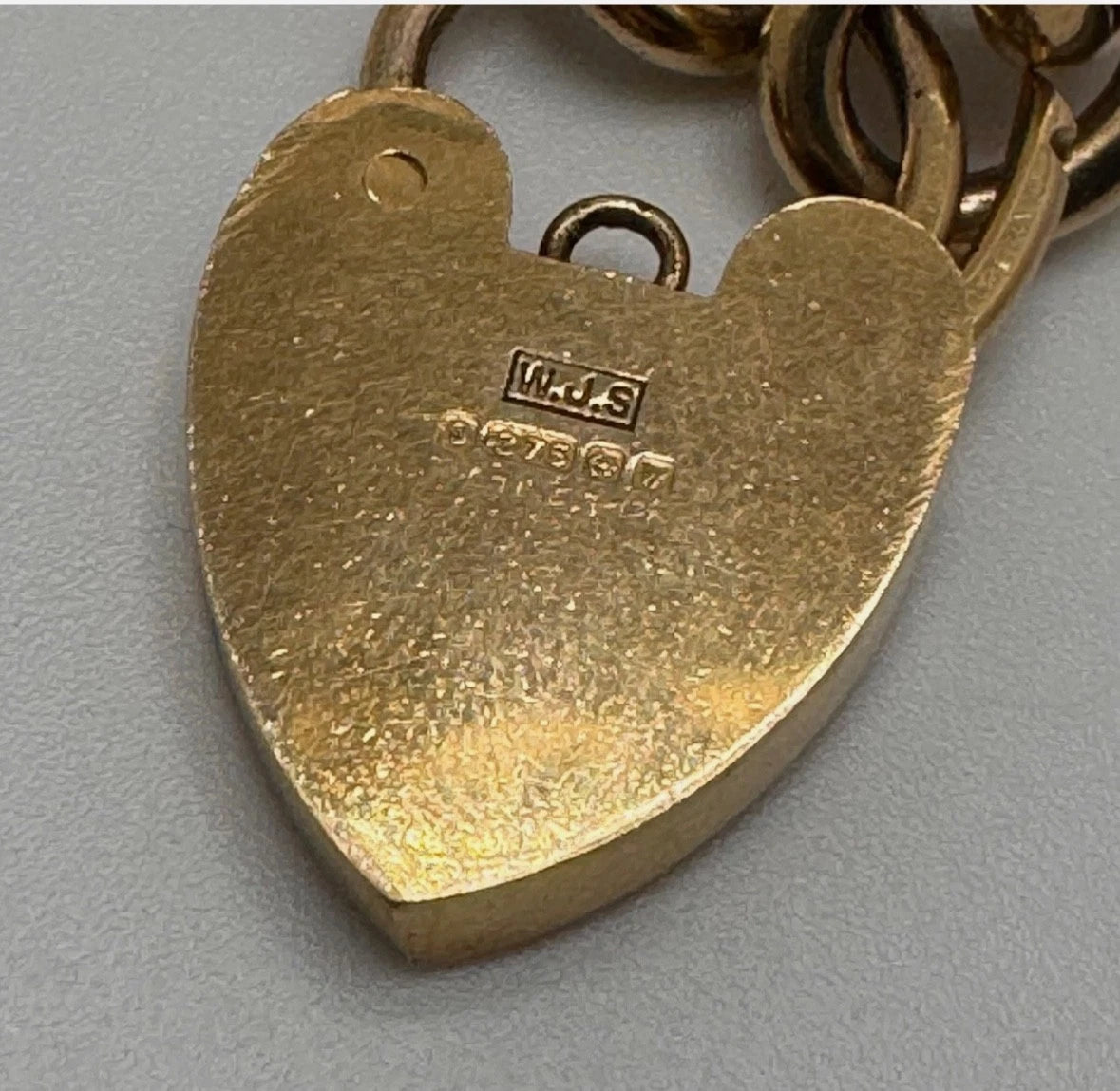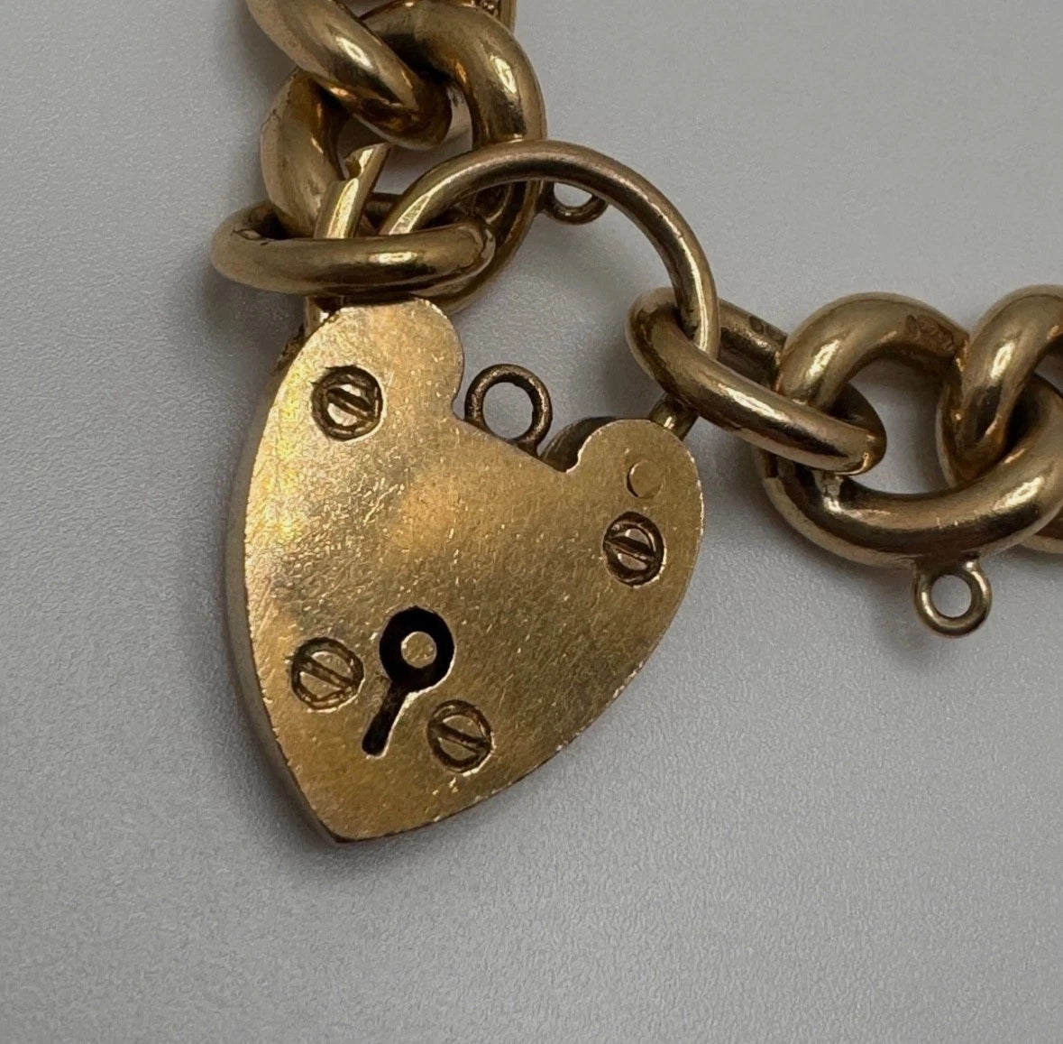 A ladies solid link 9ct gold curb bracelet with heart padlock clasp. UK hallmarks and XRF tested.