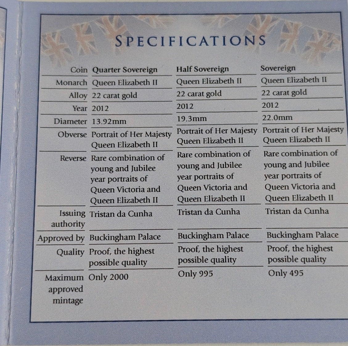 A London Mint limited edition 2012 double Jubilee double portrait gold sovereign set consisting of: A 22ct gold full sovereign, 22ct gold half sovereign & 22ct gold quarter sovereign. With box & paperwork.